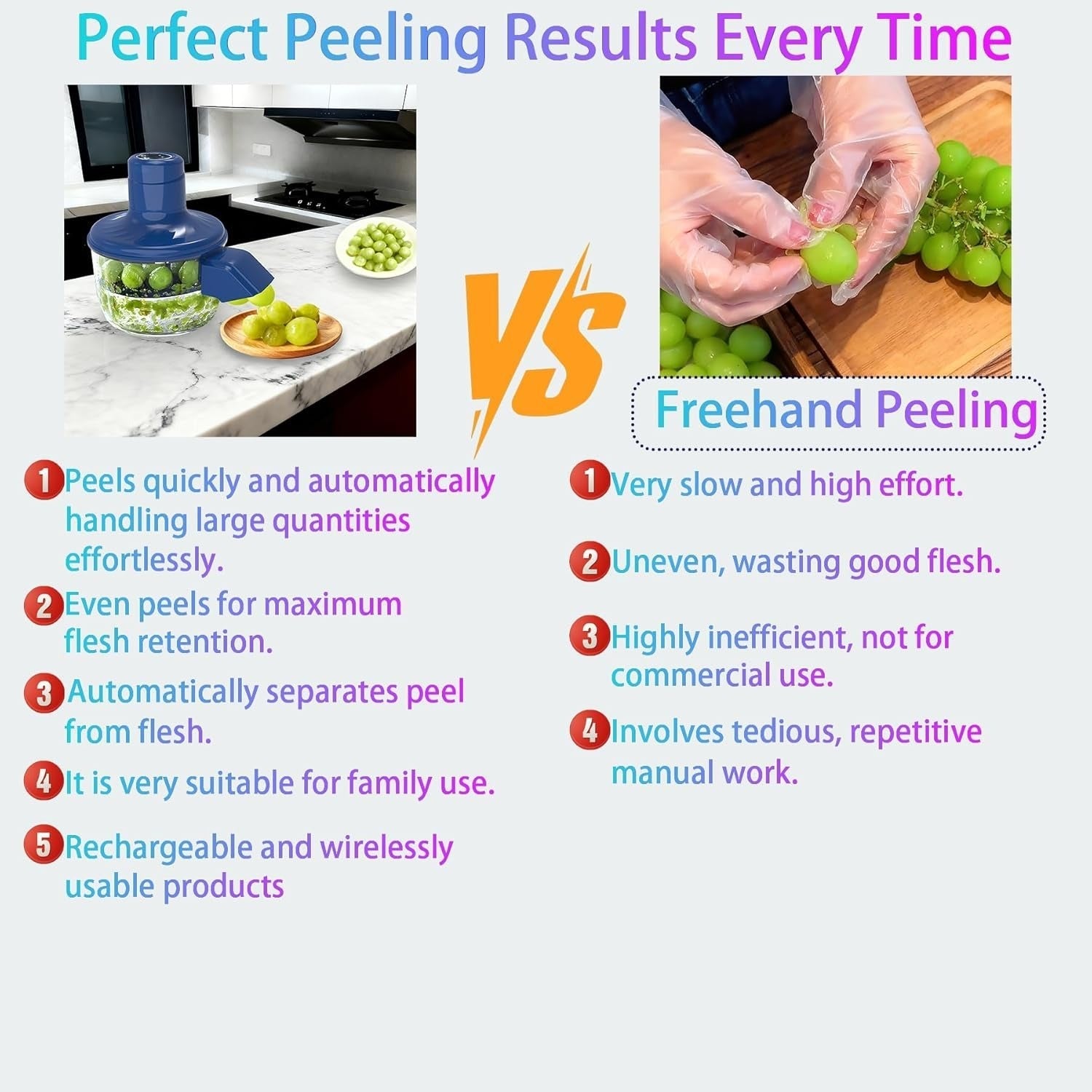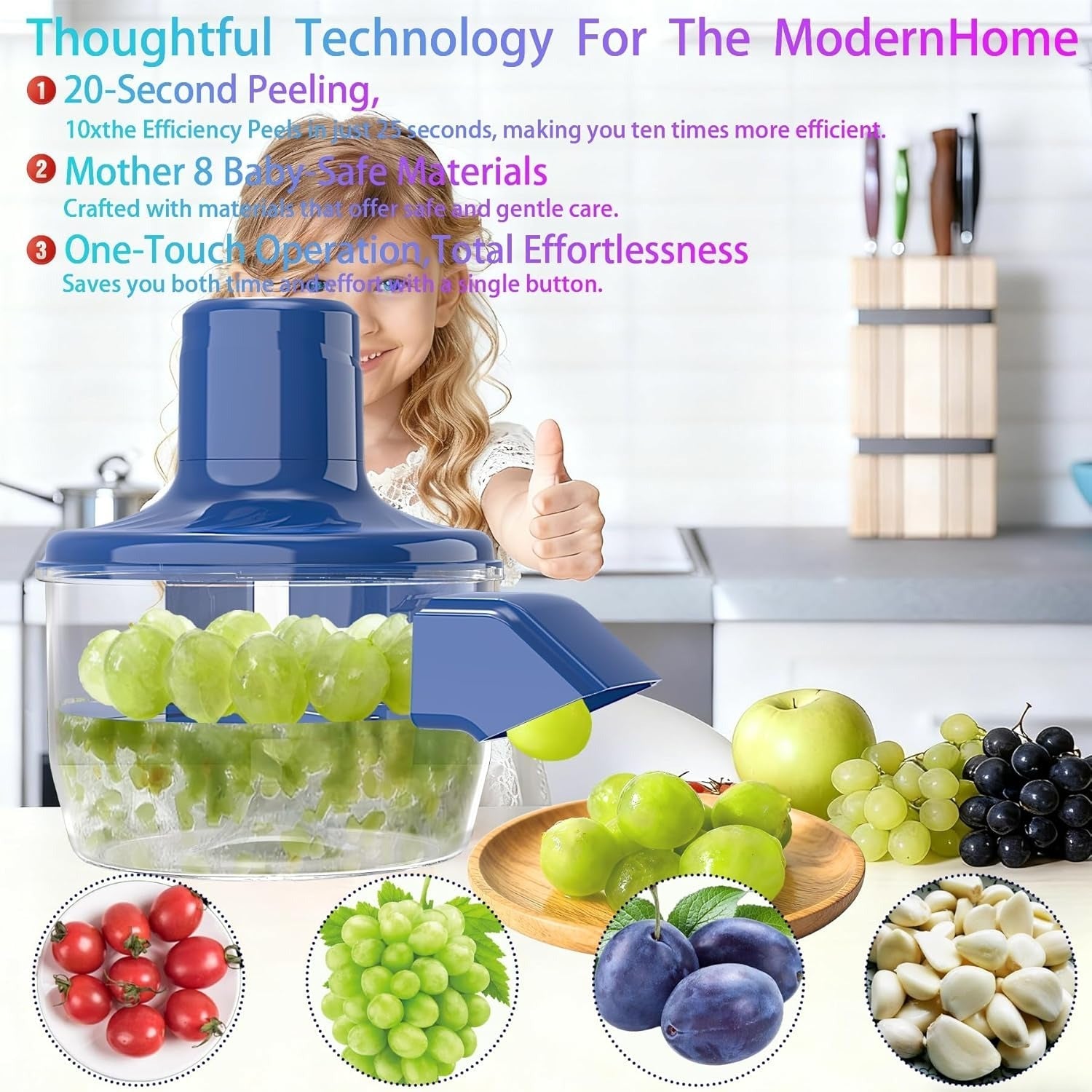 I can peel small fruits and vegetables effortlessly in seconds. Designed for convenience, safety, and speedโperfect for my modern kitchen.